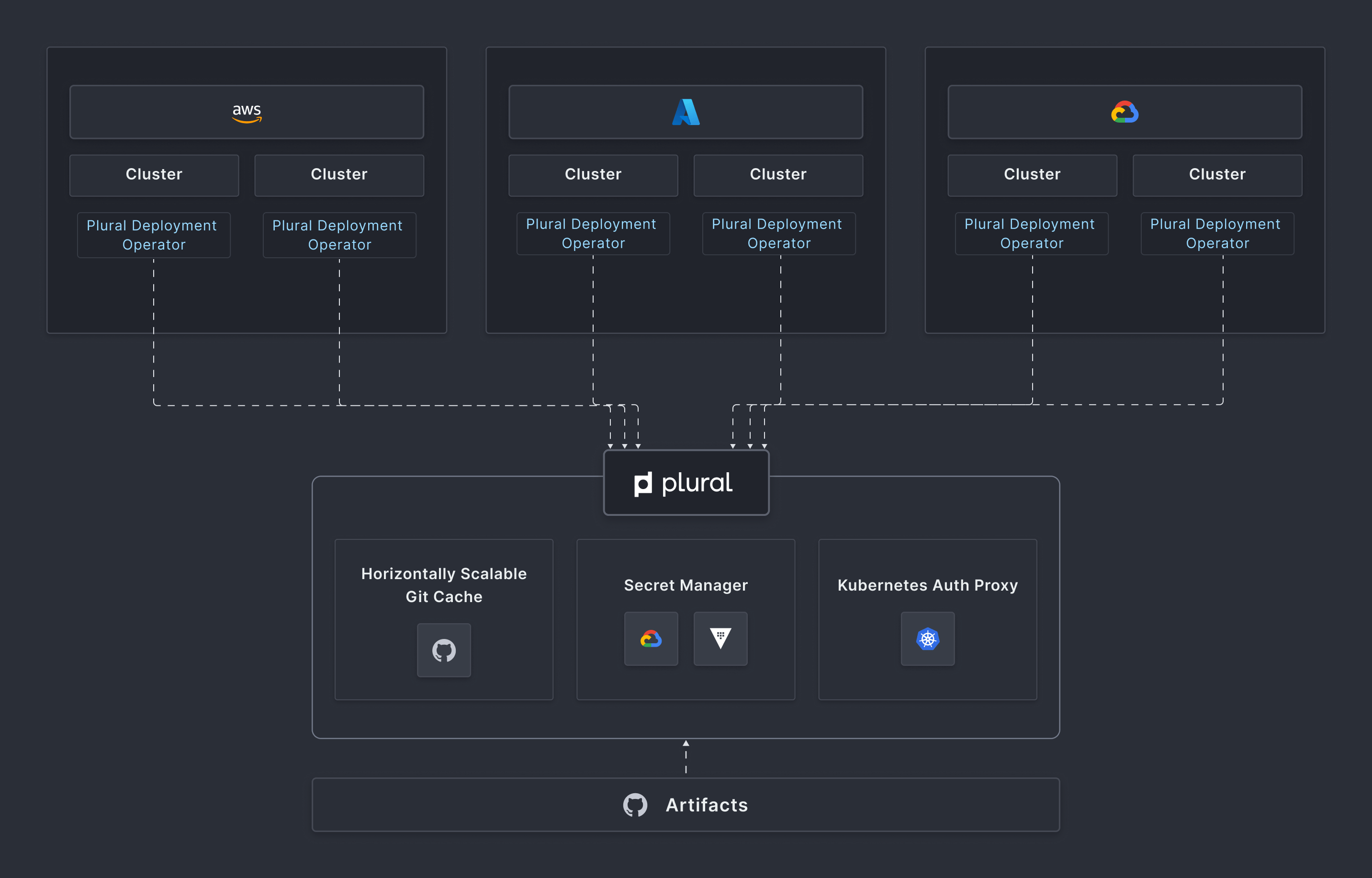 - Auth Proxy - this is a secure bidirectional grpc channel initiated by a deployment agent used to make kubernetes api calls no matter where a cluster may live and give you full dashboarding capabilities from the Plural CD UI.